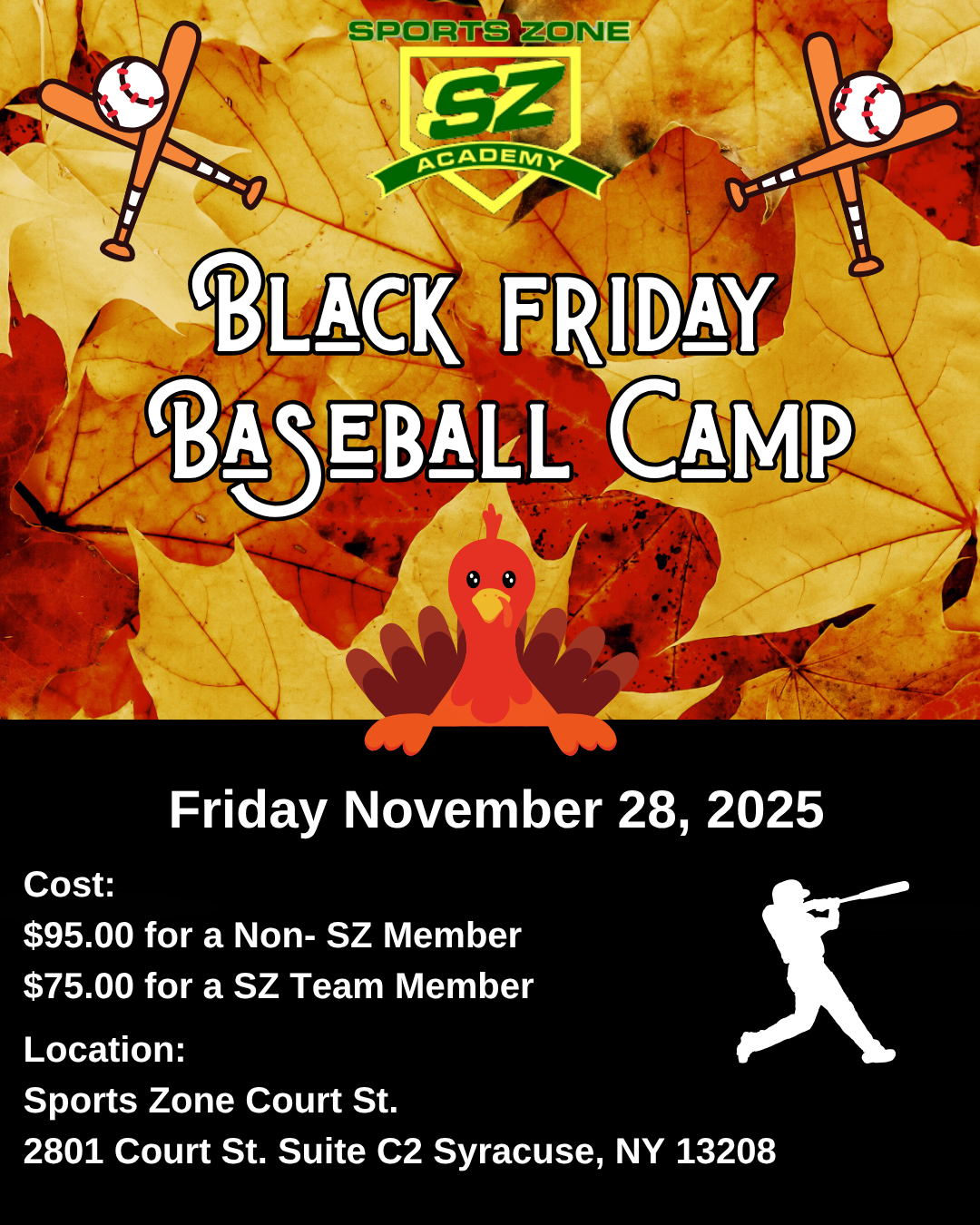 On Friday November 28, 2025 Sports Zone will host our annual Black Friday Baseball Camp. We are excited to offer a full day action packed, fun filled skills and drills and game play. Parents can use the day to go out and shop and your players can use the day to expand their skills!